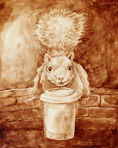 Angel Sarkela-Saur created this original “I sense a hint of nuttiness” Coffee Art® painting. It features a squirrel sipping on a cup of coffee. This framed painting is 16″ wide by 20″ tall.